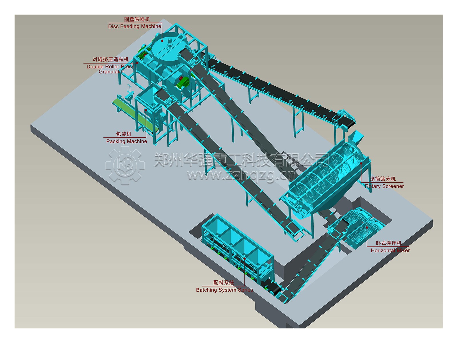 對輥擠壓造粒機生產(chǎn)線是由粉碎機—喂料機—攪拌機—分料器—對輥擠壓造粒機—篩分機—包膜機—包裝秤組成!