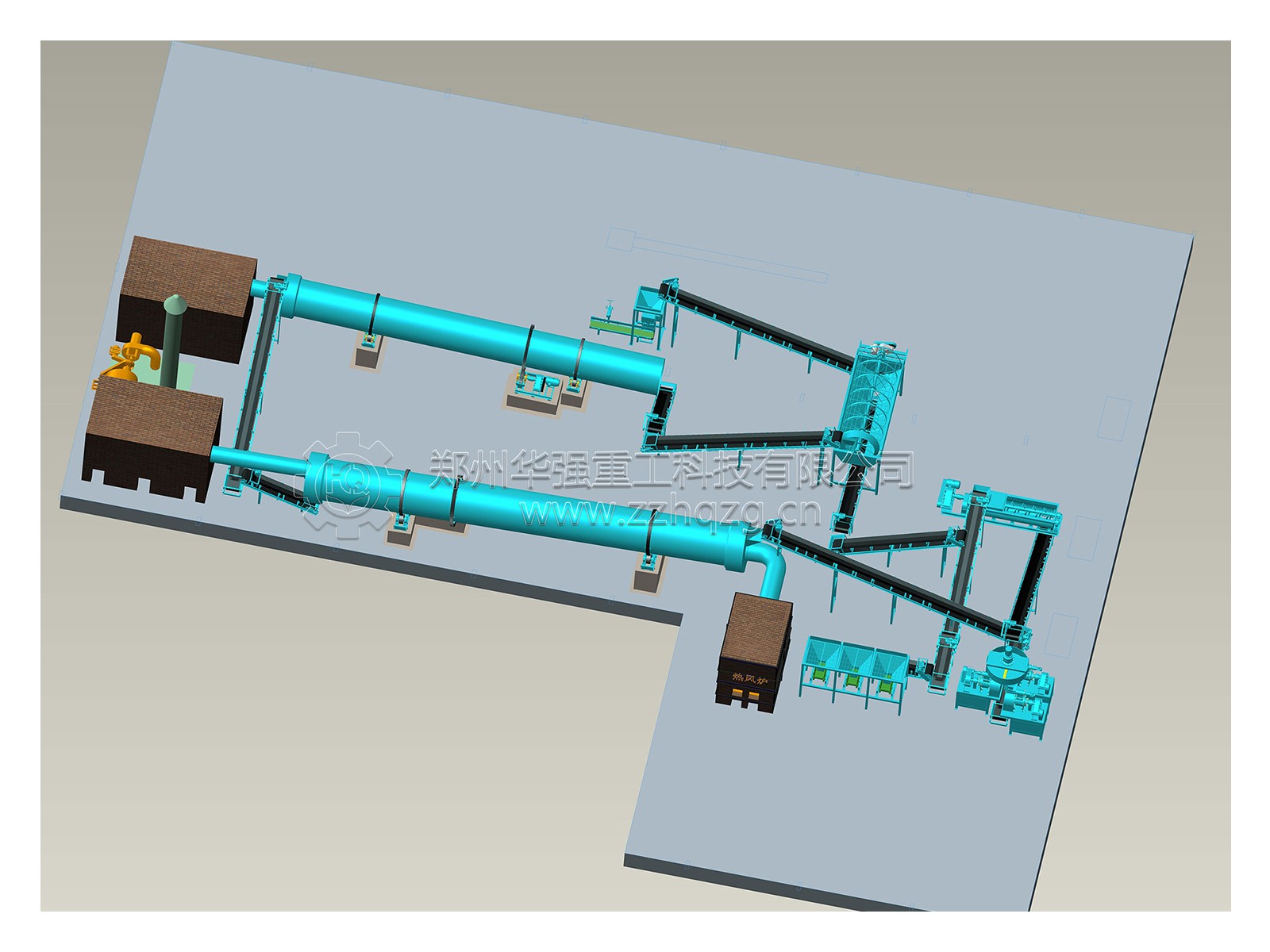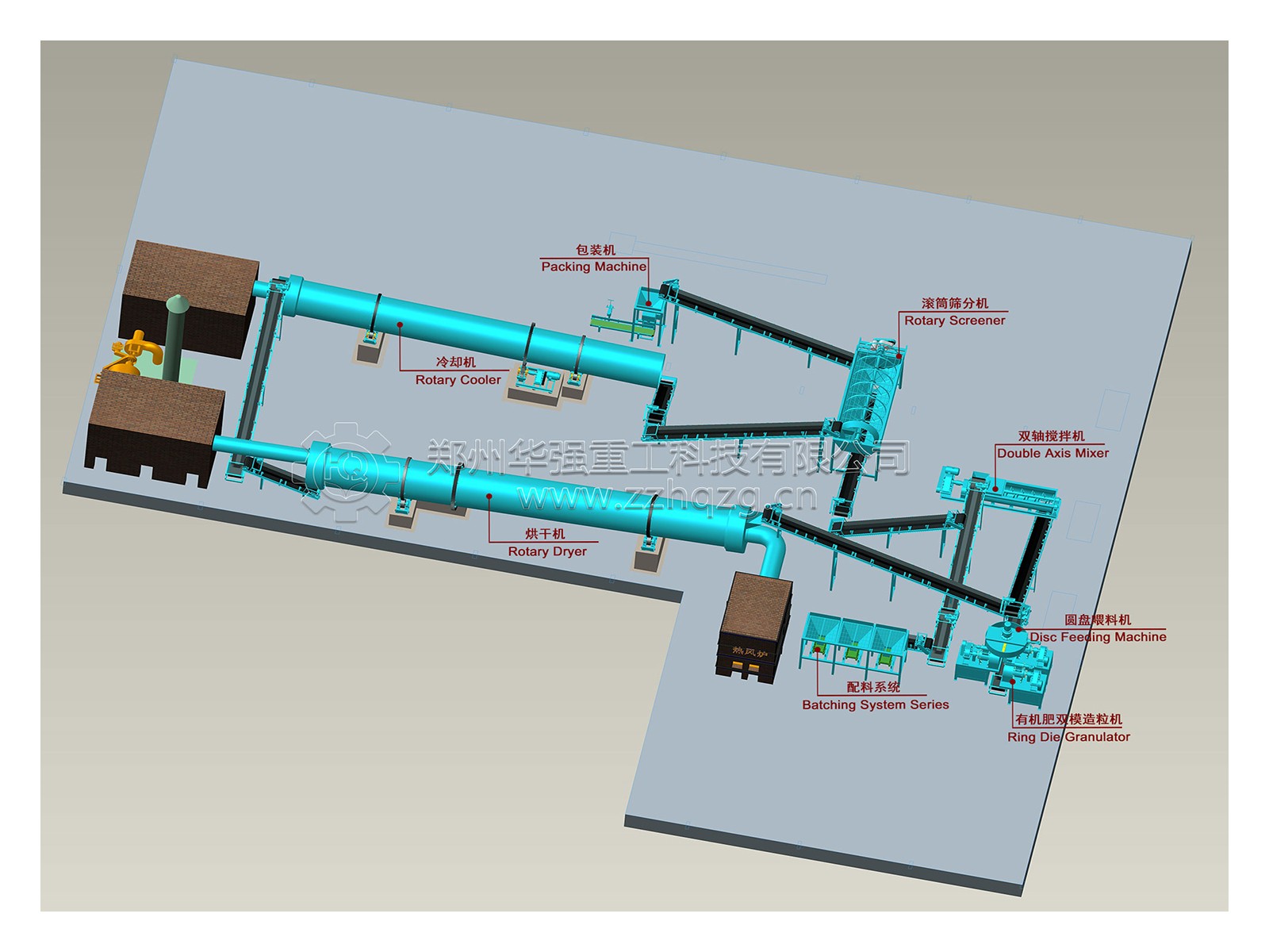 輪盤式發(fā)酵翻推機(jī)——配料系統(tǒng)——半濕物料粉碎機(jī)——雙軸攪拌機(jī)——除塵器——組合造粒機(jī)——烘干機(jī)——冷卻機(jī)——滾筒篩分機(jī)——包膜液電加熱熔爐攪拌罐——自動(dòng)包裝。
